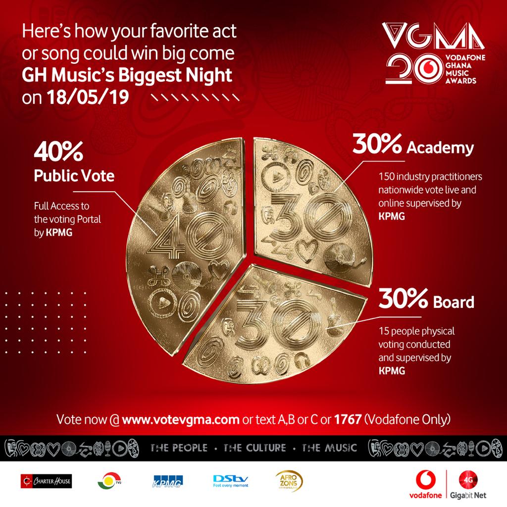 The Vodafone Ghana Music Awards maintains the 3 tier voting system i.e. the Public, the Vodafone Ghana Music Awards Academy and the Vodafone Ghana Music Awards Board with the following percentage splits: